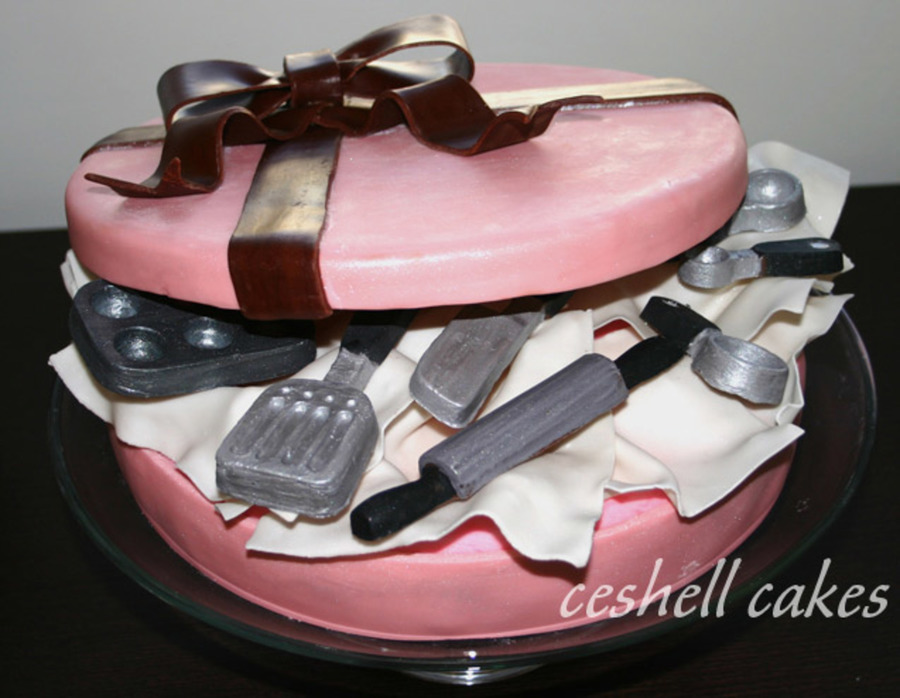 I was so excited to try one of these! The cake is short because it's a flourless chocolate (which, with great effort, I torted + filled w/raspberry puree...it was like cutting thru clay) topped w/whipped ganache. All decos' are fondant except the baking tools which were made using a chocolate mold+painted w/food colo. and luster dust. The lid is fondant w/gumtex (and a cardboard cake circle for stability). Thanks to everyone here for inspiration and help - couldn't have done it without you!