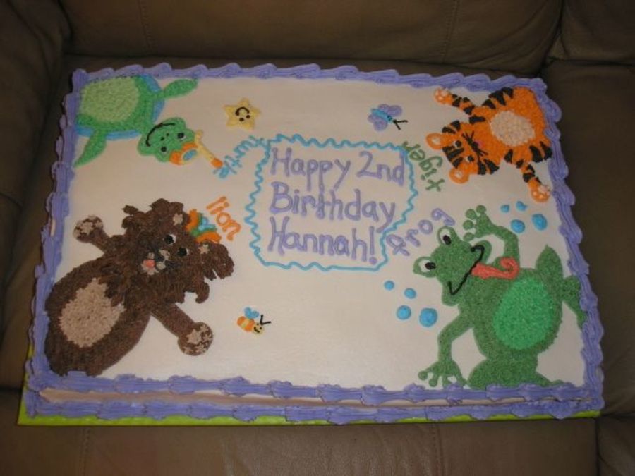 Another Baby Einstein cake, made to look a little more girly by doing a purple border instead of blue. 12x18 half chocolate, half yellow with regular buttercream icing, freehanded drawings.