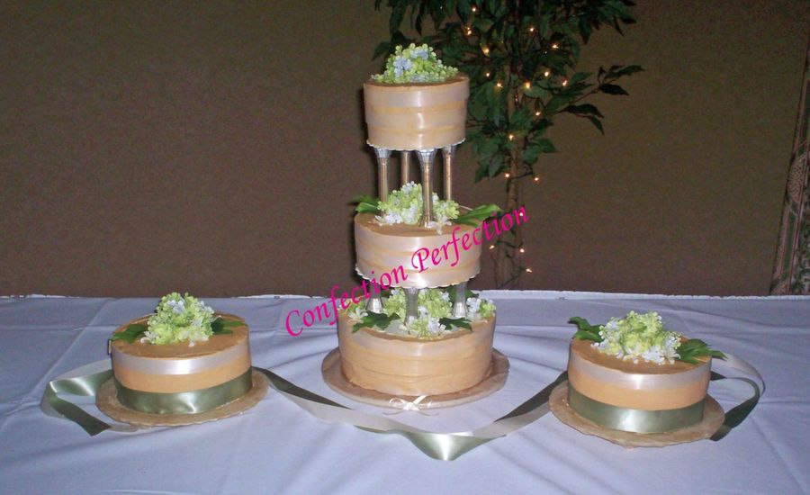 Iced in dark Ivory Buttercream There are 3 ivory ribbons on each of the center tiers. On the side cakes there are ivory ribbons on top and green ribbons on bottom.