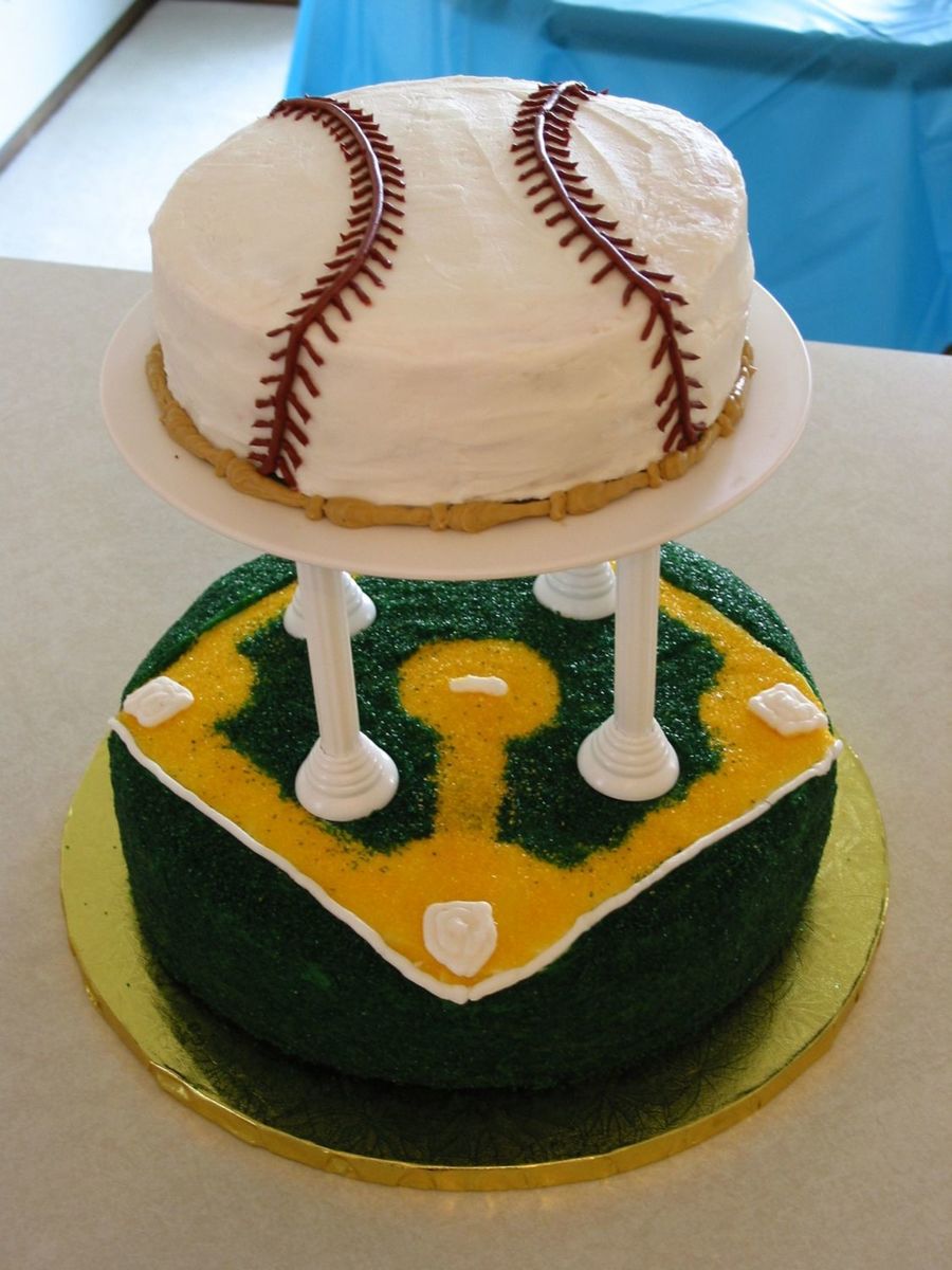 Maddog09 on 6 Dec 2006 , 7:23pm This is one of my first cakes. The field is topped with colored sugar for texture. The border on the top layer is baseball bats (if you couldn't tell)