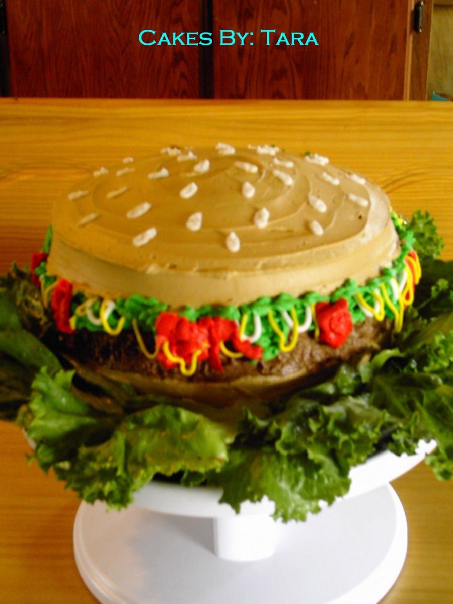 My Very first Hamburger Cake :) Next time i will make the top more rounded lesson learned,lol. I Made this for my neighbor boy's Boy Scouts Troop.They wanted a really big burger and they got one! Bottom and top "Buns" Are Yellow cake and the "Pattie" is a brownie.All Vanilla buttercream except the "pattie" is chocolate Buttercream.The lettuce is real and just for fun! TFL