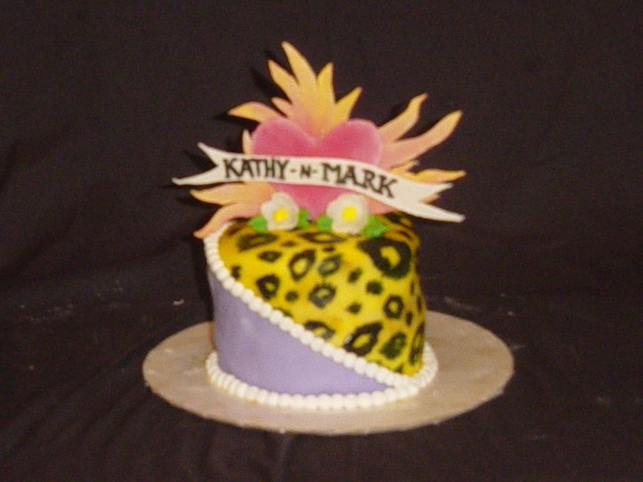 This cake accompanied the main wedding cake. I wanted the bride to have something that represented her funkiness. She has lots of tattoos and is very artsy. I put her and her groom's names across the middle. The cake topper is supposed to look like a tattoo design. The perriwinkle sections coordinate this cake with the main one.
