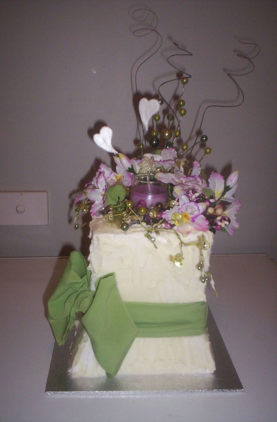 i posted a forum today saying that after the 3 cakes i have done in the last two days i was all caked out! well after 2 hours of having nothing to do i decided to make this dummy...its a new shape of have been wanted to try. floral topper is mostly artifical flowers with a scented candle in the middle. had some left over BC so i used that to ice. then just made up the sash and bow...i would love to hear your comments, opinions etc.... thanks...