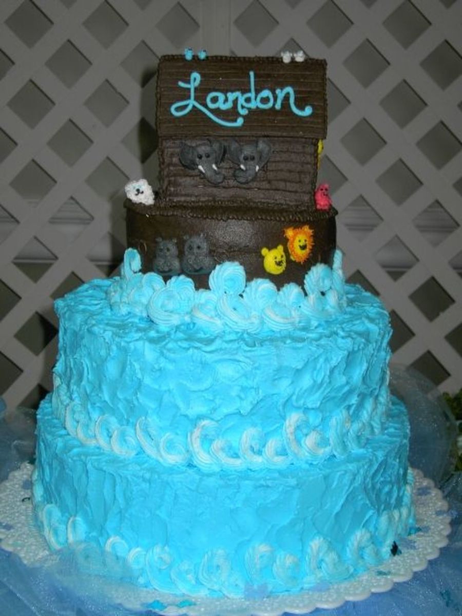 this was a baby shower cake i made for my cousin and his wife. the bottom layer was styrofoam, the middle layer and the ark were cake. white cake with buttercream icing and animals pipped on the side of the ark.