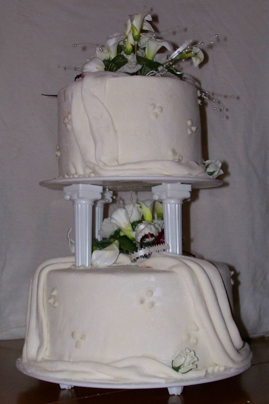 This is my first attemp (just for practice) at the wedding cake that I am doing for my sister in September. The real cake will be 4 or 5 tiers high. I was very dissapointed with the push in pillars that I used for this cake ( they are very wobbly) so I went out and bought the 5 " curved pillars instead.