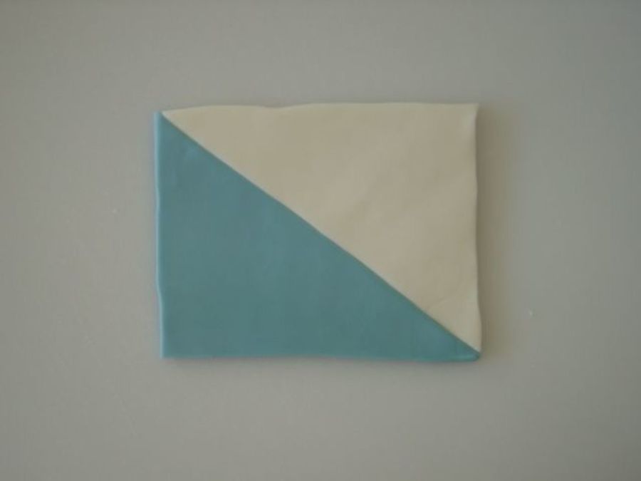 Roll them out the same thickness, and cut out a triangle of each. Arrange the triangles into a square or rectangle. Pic 2