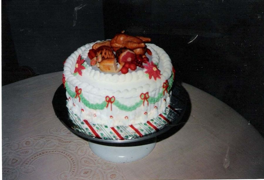 Butter Layer Cake with Christmas dinner of Turkey, Ham, potatoes. bread & pie made of marzipan.