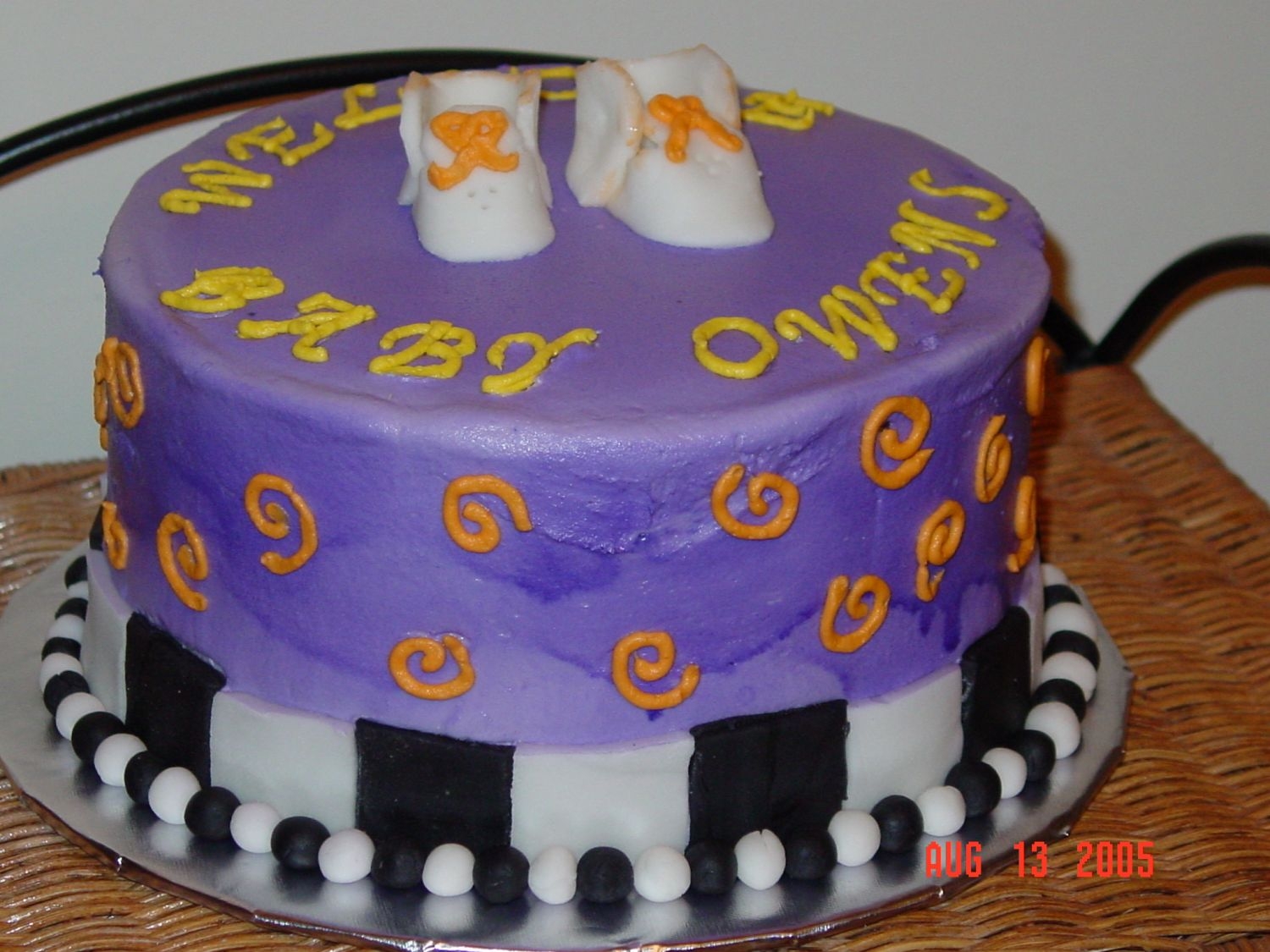 The lady who ordered the cake wanted the cake design to match the baby's room! Black and white checks, purple w/splashes of yellow and orange! I didn't know what I'd do, but I love the way it came out! 3 Layer choc fudge cake w/raspberry filling (thanx ladycakes!) and BC frosting....& fondant decor! Whew!