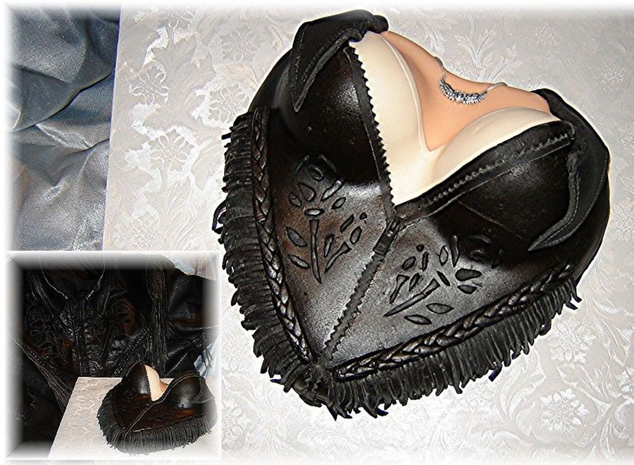 This cake was made for my mother-in-law who happens to be a harley chick. I borrowed the jacket idea from pyxxydust and used the lingerie body cake idea from cakesbyallison, thanks to both of you. I wanted a feminine Harley cake. The jacket was made to look exactly like my mother-in-law's. Chocolate cake with MMF. The necklace is MMF painted silver with luster dust.