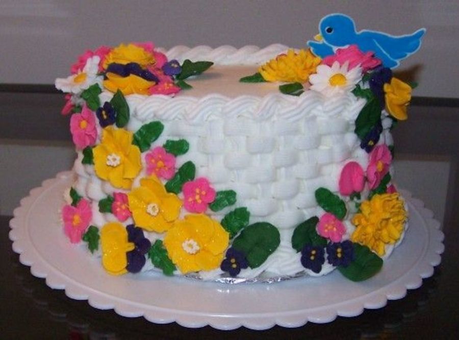 basket weave cake with royal icing flowers.