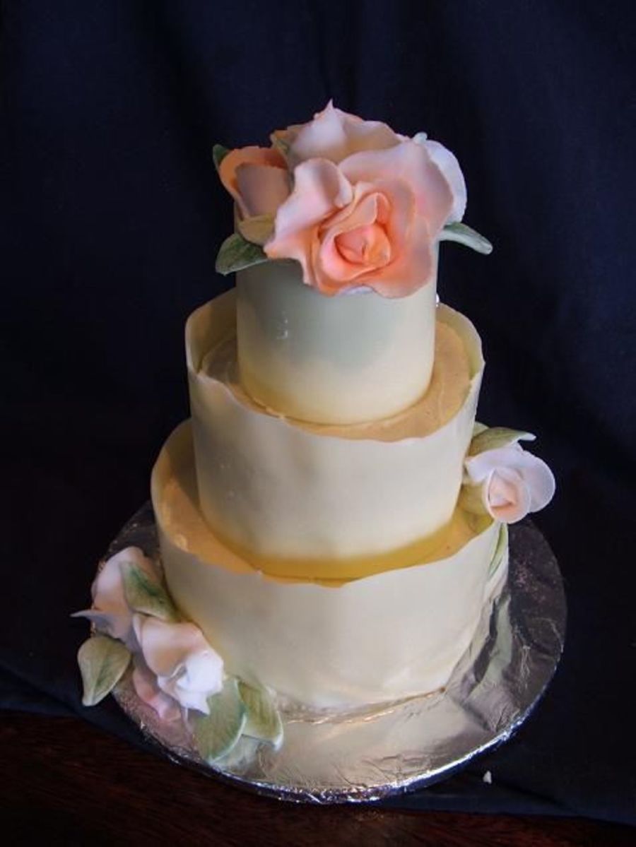 this is a chokolate fudge cake with strawberry bc filling , covered with butter cream and white chockolate collars, gumpaste roses.. this cake is tiny , about enough for 3 people , it was yummy too apparently, thanks for looking