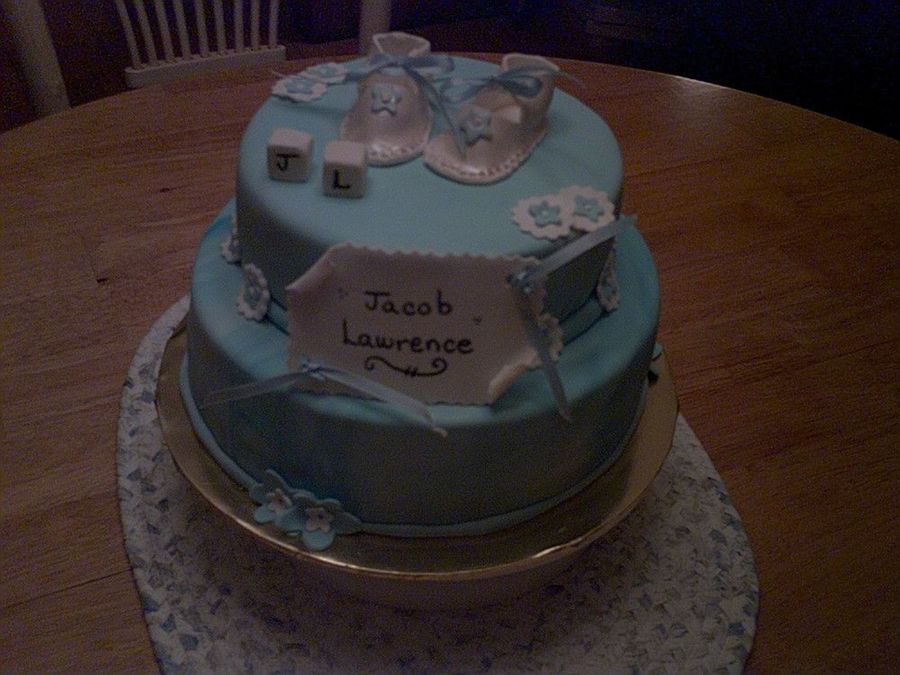 For a christening. Choc layers cake on bottom/WASC as top tier. Baby booties and gumpaste sigh. Fondant accent flowers. Having a terrible time with my camera....Thanks for looking!