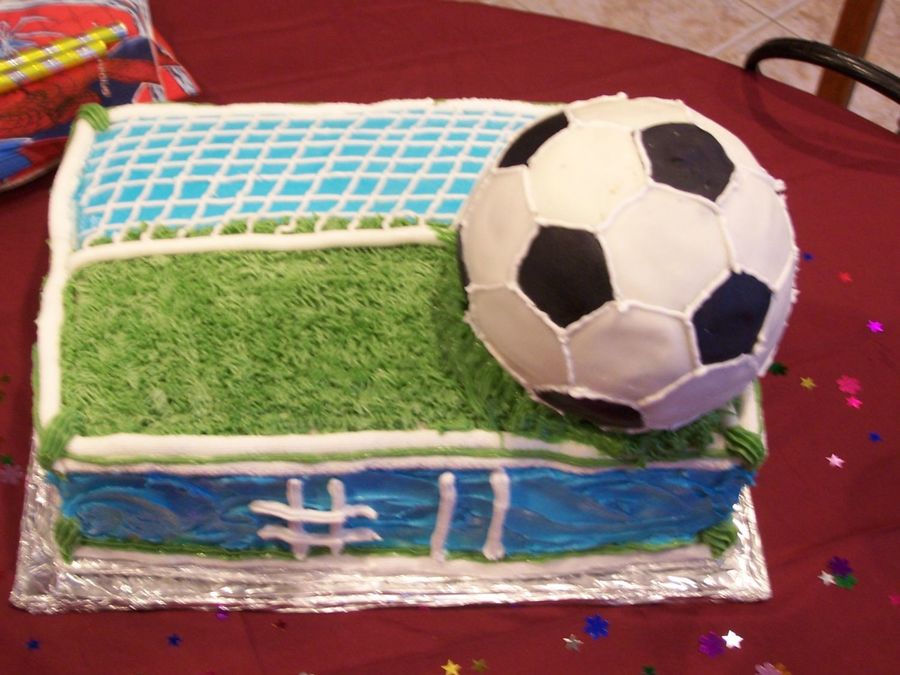 This cake was for the brother of the girl that I made the Dora cake for, they had their parties the same day. German chocolate cake with banana filling and covered with almond flavored buttercream. I had the worst time of my life with this cake, temperature high 90s, humidity very high, buttercream would not stick to the cake, fondant would not stay on the soccer ball. It just kept falling, I was not even able to get the borders to stay up. By the way, this cake was based on one of MillyCakes', thanks!