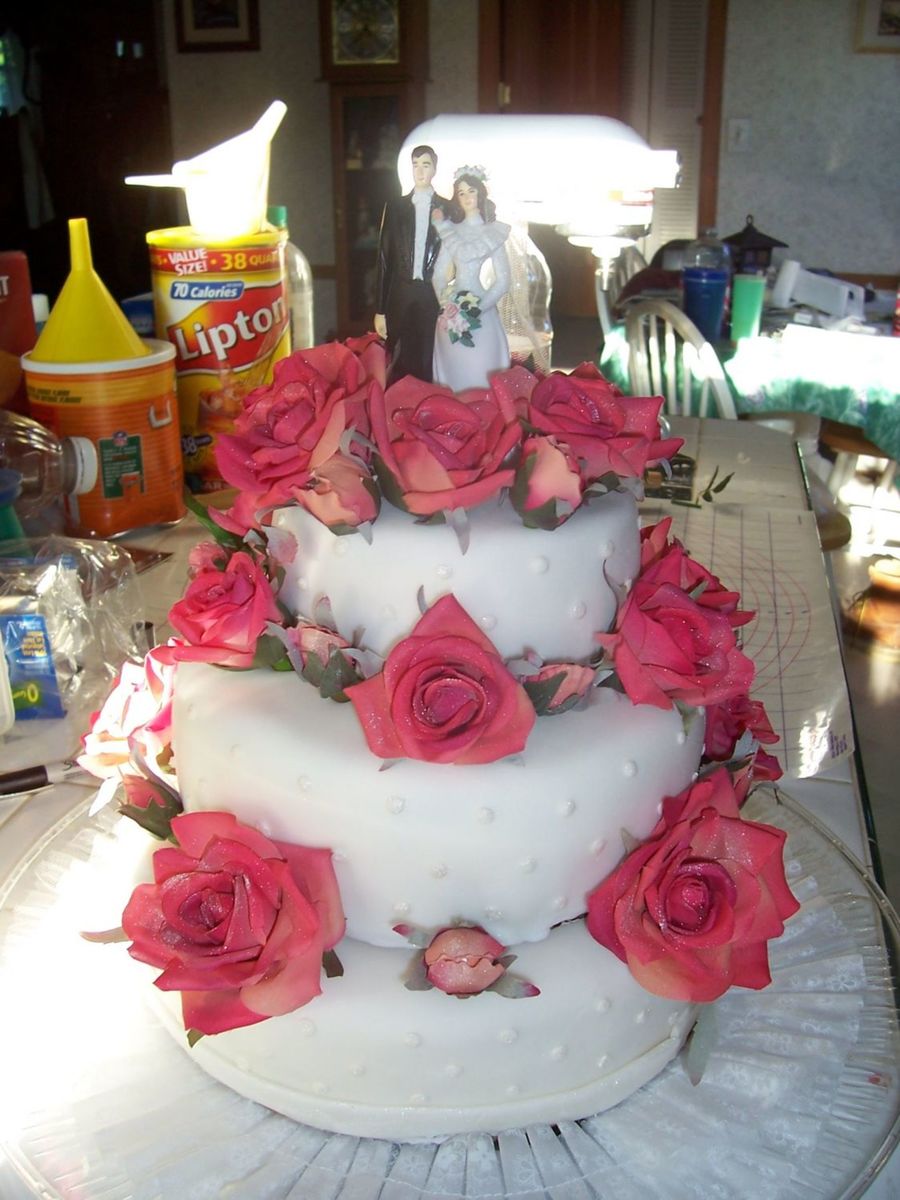 Fondant covered BC Yellow cake, with chocolate moose filling. Those are fake flowers.. But they were a big hit!