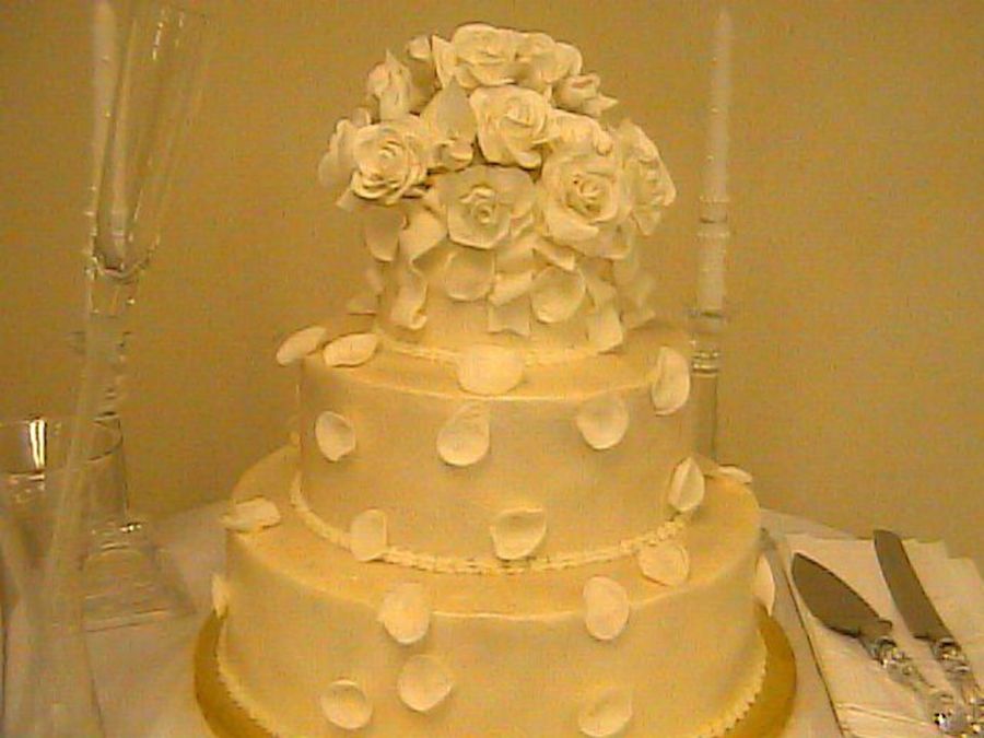 This was inspired by Florimbio. I loved the rose petals falling from roses on her cake! It was so pretty!! The bride didn't want anything on the cake (scrolls etc) and needed a topper. I made the petals from gumpaste. The cake (not the flowers or petals) was sprayed with luster dust in 3 different colors but of course the camera didn't pick that up LOL