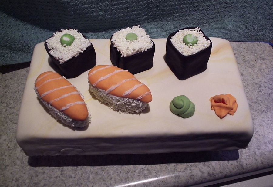 6"x12" "block" cake covered in marbled fondant (tried to make it resemble wood but everyone said it looked like marble) with cake & fondant "sushi". The "rice" was candy sprinkles. My brother LOVED it!!