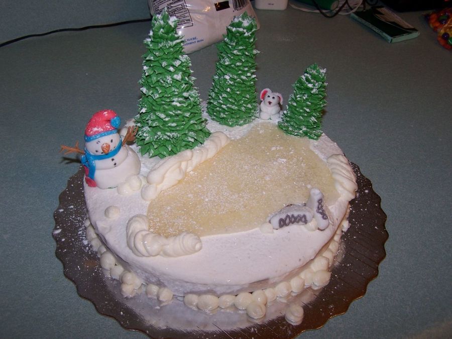 I made this cake for fun. It is iced using the faux fondant method, i really like it, its so easy to do!!! and this was the first time making these trees too... 2 bunnies, some skates, a snowman and lots of snowballs.... also an "ice rink" is in the middle.... hope you like