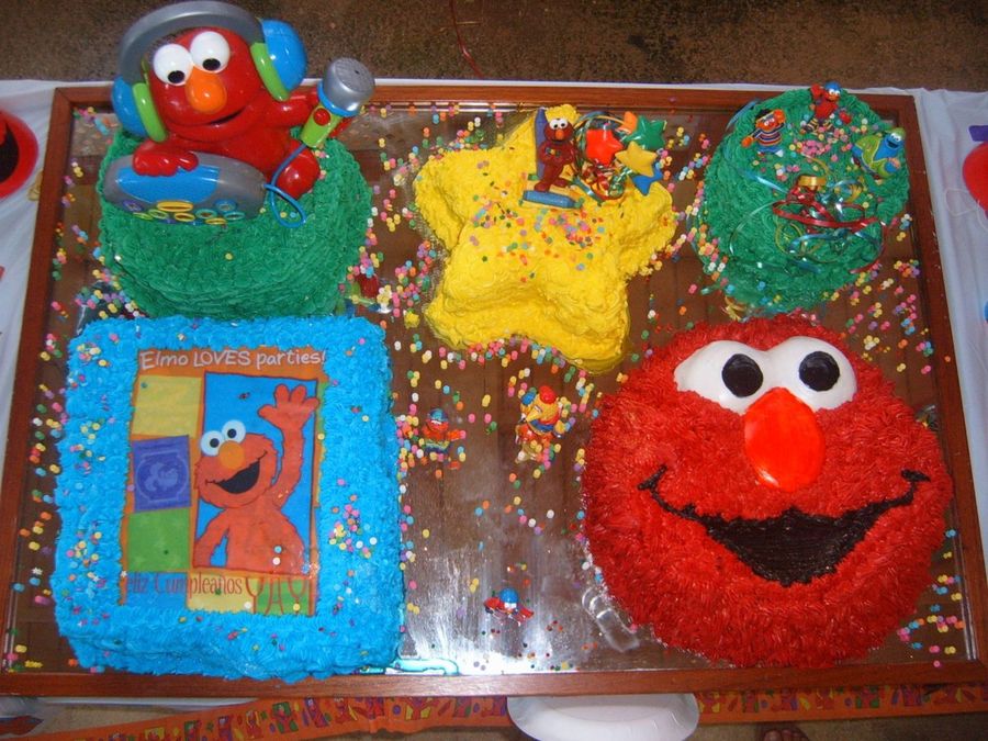 Bizcocho de Elmo, tiene 5 tortas. Utilicé el molde de Elmo de Wilton, una estrella, un bizcocho #8 y un #10 cuadrado y uno redondo #6. El el cuadrado coloqué una hoja de azúcar con la portada de la invitación de la fiesta. Gracias a Dios a todos les gustó.