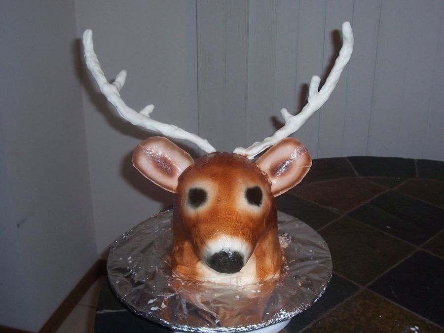 I did this one just to see if I could do it. I was very impatient though. I didn't let the gumpaste ears dry enough, so they cracked and needed support. I also didn't let the antler's dry so they are drooping. Pretty good for a first try at it, though. Second time will be much better. Fondant antlers, gumpaste ears, buttercream icing, pound cake base, rice krispie treat head and snout, and airbrushed.