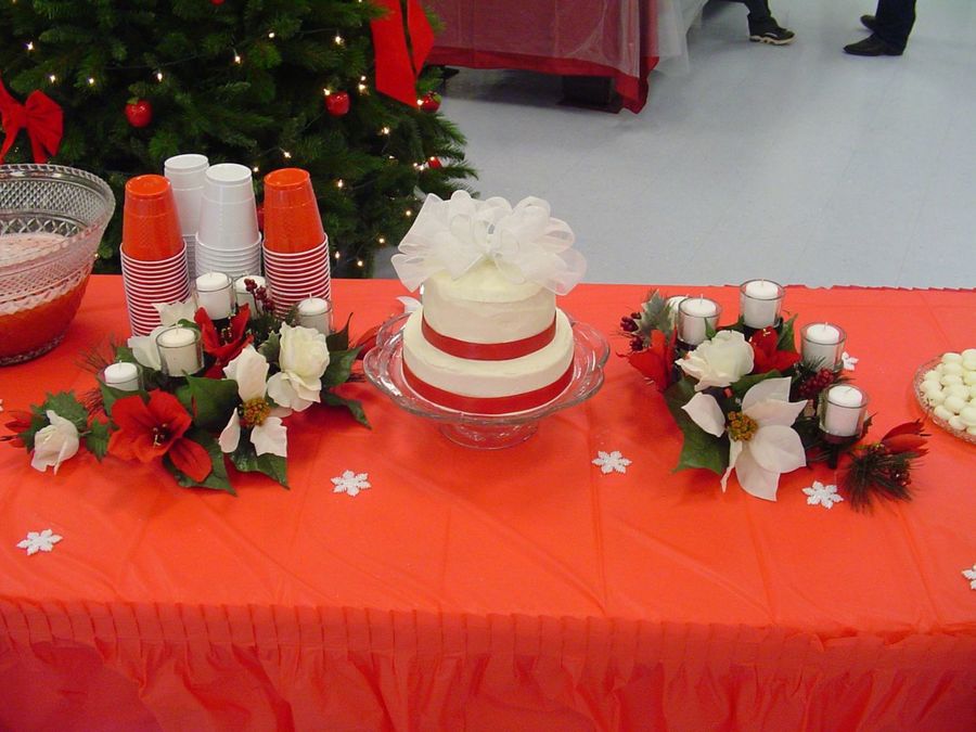 8 inch and 6 inch white cake with buttercream frosting. Bow is fabric with red ribbon around the bottom. My first offical wedding cake made for a reception. Also my first offical stacked cake, other than practice cakes Everyone loved it including the bride.