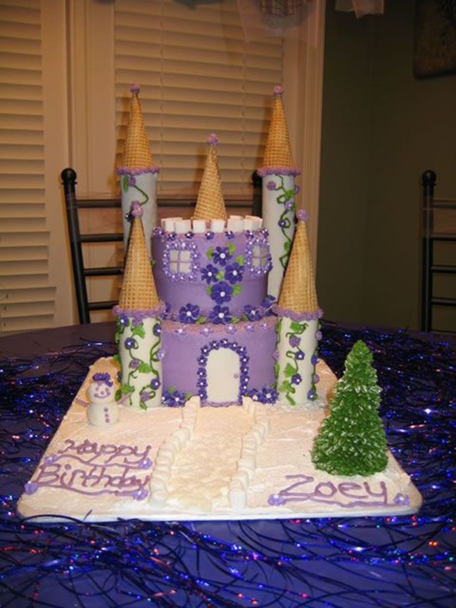 This is a Princess Castle cake with Snow since Zoey's Birthday is right before Christmas. The cake is a 9inch round on bottom with a 6inch round on top. Fondant door and windows, cobblestone pathway and snowman. All else is buttercream and royal drop flowers. Toliet paper towers and paper towel holder towers.