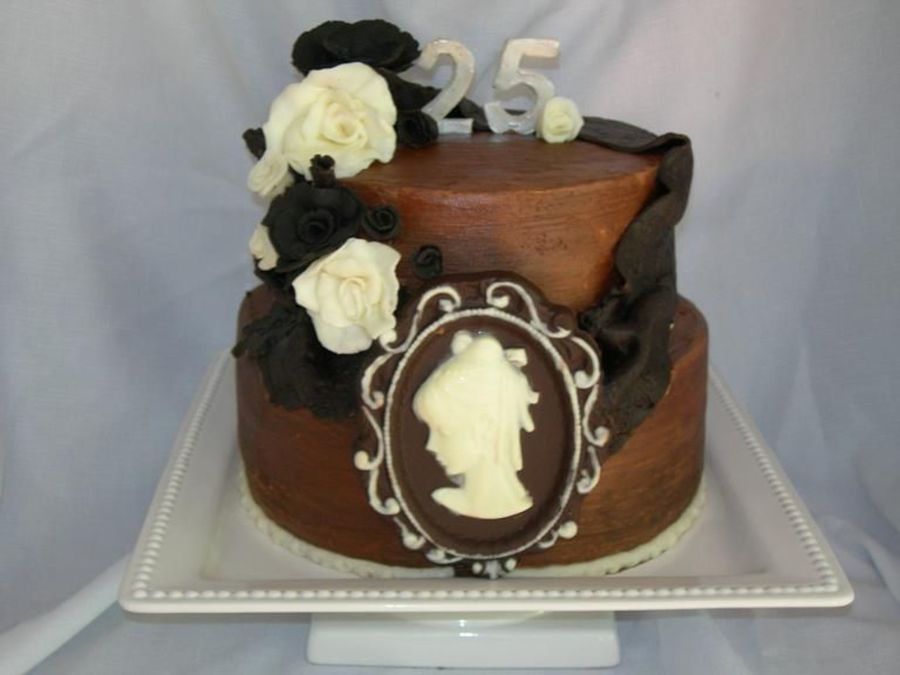 covered in buttercream, draped with chocolate, choc. roses, solid choc. cameo and gumpaste 25 painted with silver luster dust