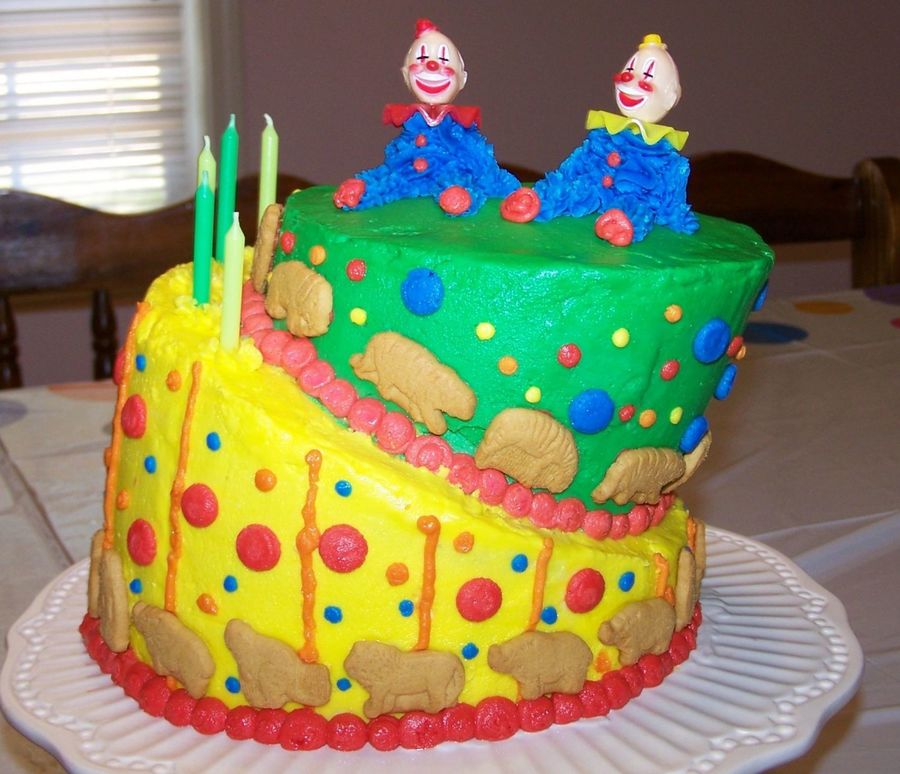 My sister and I made this for our little sister's fifth birthday today. This is our first topsy turvy cake and I think it's so cute! It's not perfect, but I still love it. White cake with buttercream frosting decorated with Wilton clown heads and animal crackers.