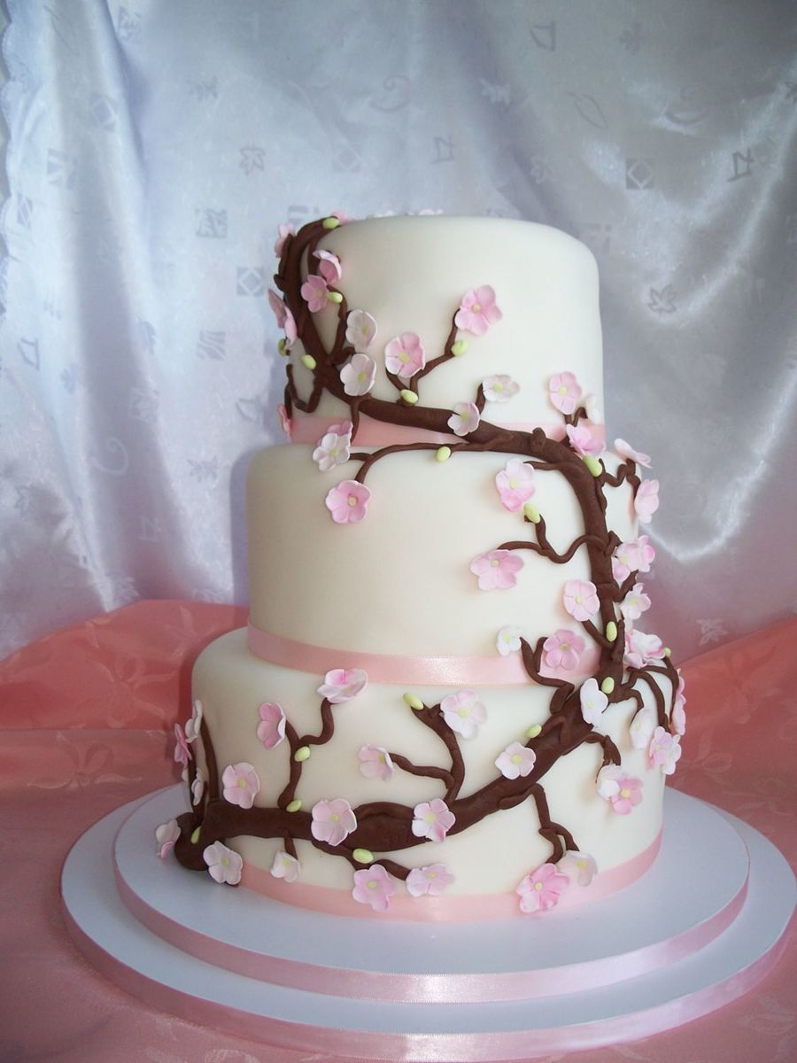 This is my first cherry tree cake based on a picture the bride gave me. Sorry I can't give credit to the original cake designer because I don't know where she got the picture. For the tree, I used chocolate fondant and the blossoms are sugarpaste.