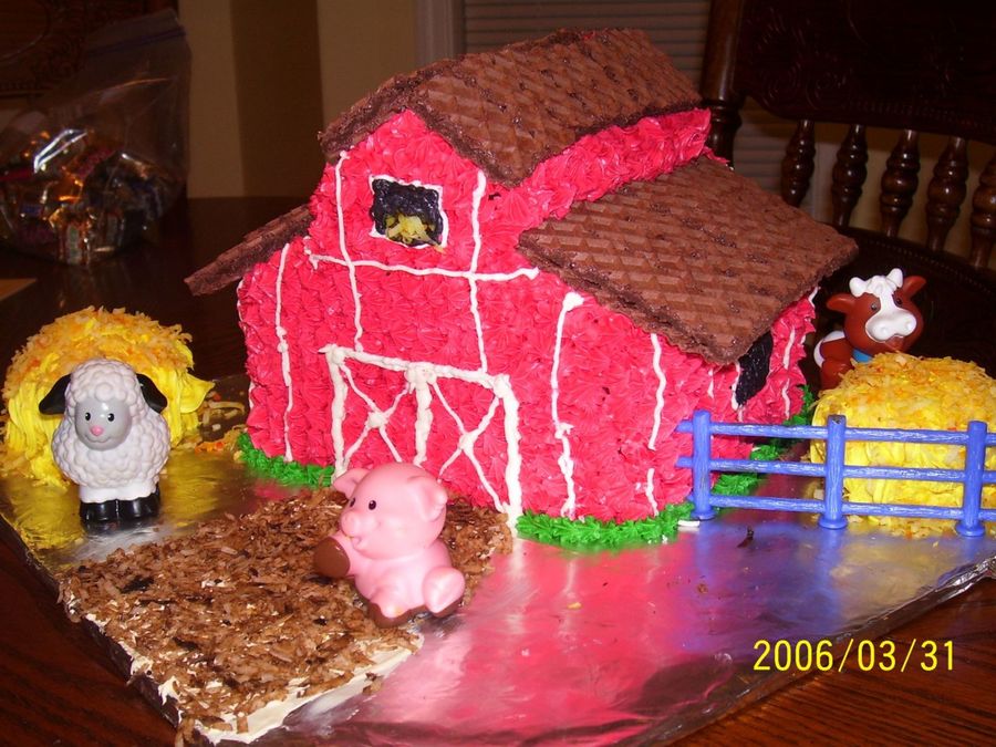 Very simple. I used 3 square cakes and one loaf pan cake. Trimmed the loaf cake to shape of roof. Used sugar wafers for roof. Used cupcakes for haystack with tinted yellow coconut.