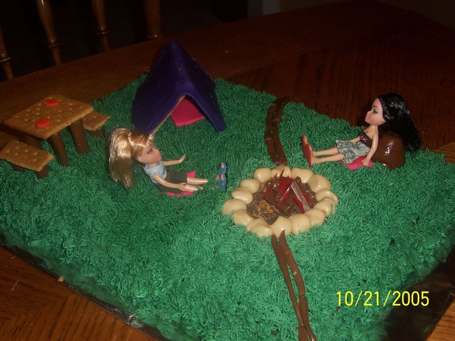 My daughter wanted a Bratz cake with them camping.
