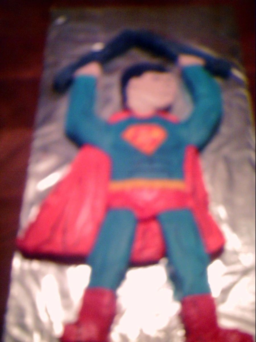 white and choc cake cut to make 5 foot tall man of steel. buttercream and royal icings. sorry very bad camera.