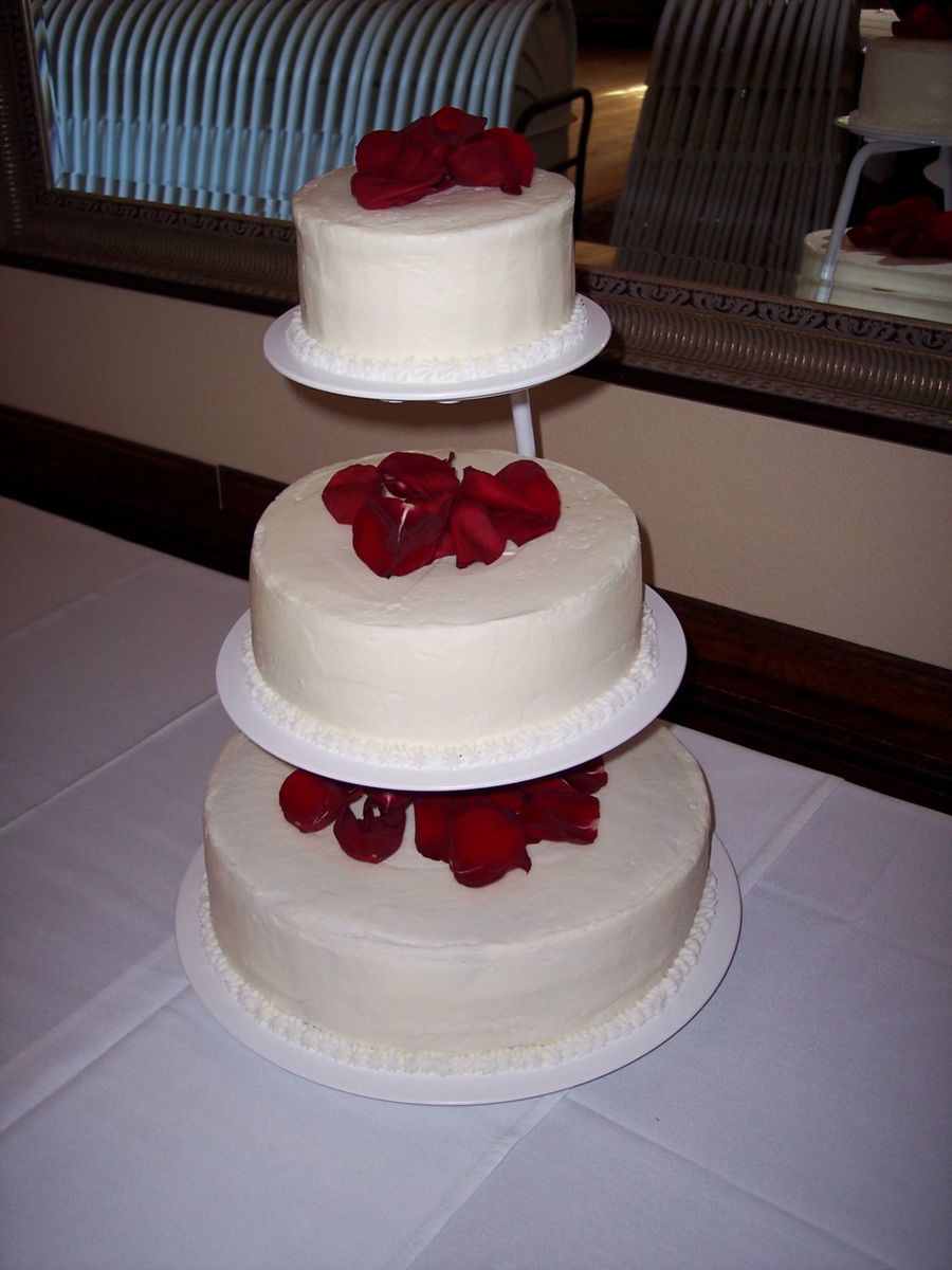 This is a basic buttercream wedding cake with flower petals on top. Simple but elegant.