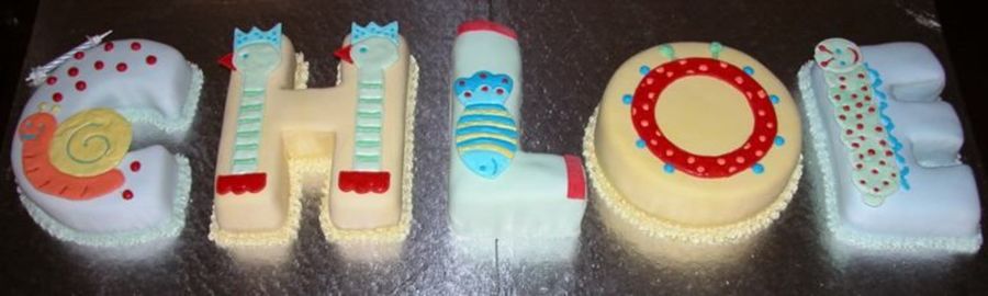 Carrot cake with orange bc and covered in fondant icing with royal icing accents . Made to match the invitation - for a 1st birthday. Serves 40. The "L" is unfinished as this pic was taken before I delivered - had to finish up on site as the cake was on 2 seperate boards (could not find any long enough to accommodate it) and the "L" sat right over the join (conveniently planned!!)