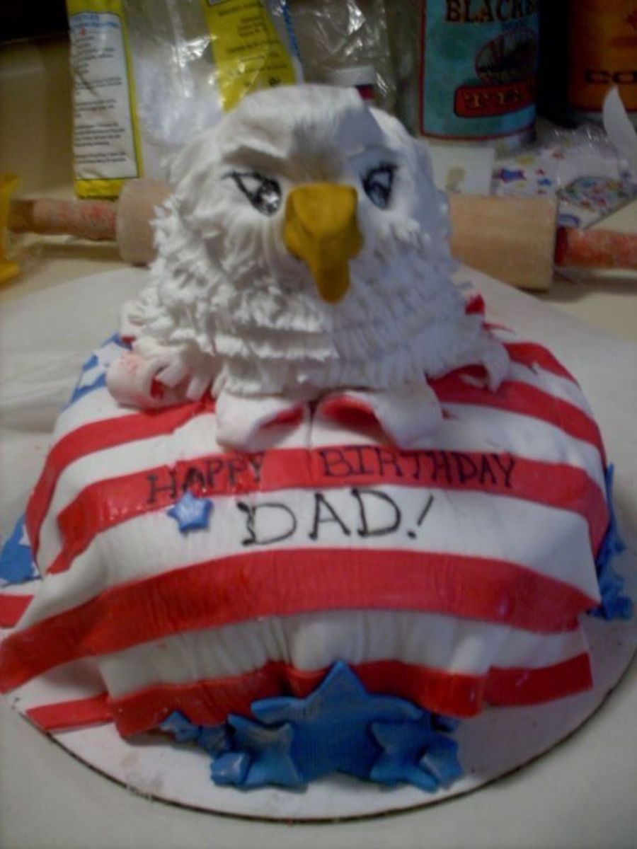 This was a round cake covered in fondant.The eagle was cake baked in 2 cup pyrex and covered with layers of fondant to create the feather look.