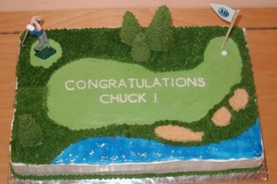 Grass tip used for the rough, tinted piping gel for the water, and crushed nilla wafers over tan icing for the sand traps. Cake size was 1/2 sheet (12x18).
