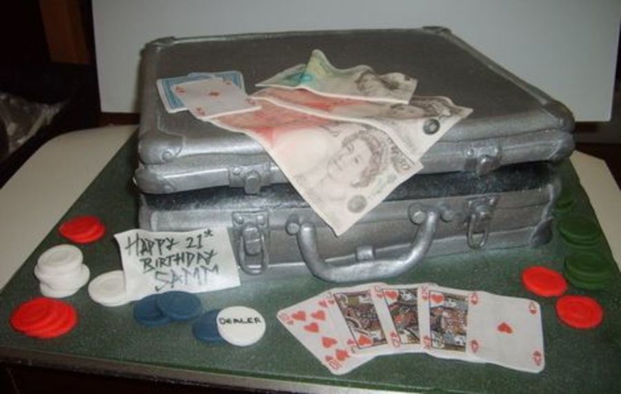 Done for a 21st birthday, customer wanted a cake that expressed her son's love of poker. Everything seen in the picture is edible... including the money & the cards - 'Straight Royal Flush'. Customer was blown away as she couldn't believe it was cake, and kept asking if her son had to cut it & how to cut it. I was really pleased with the finished look. All modelling done in fondant, satin silver luster dust used on case.