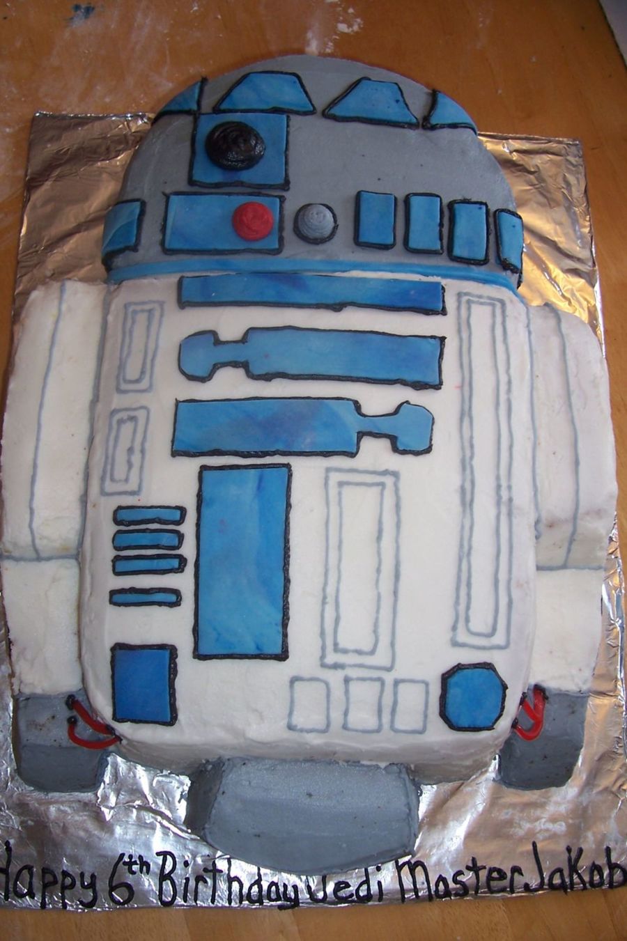 My friend wanted her son to have a R2D2 cake, all i used was an 8 inch pan for the head, and a 13x9 pan for the body. The cake was iced in buttercream then i used fondant for the small parts. Then red licorice for the for the wiring.