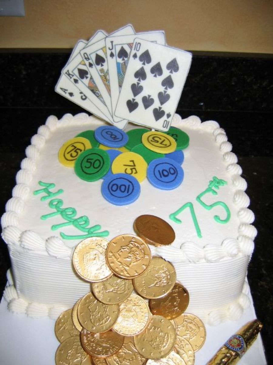 Edible image "glued" to white chocolate, fondant poker chips, chocolate coins and cigar