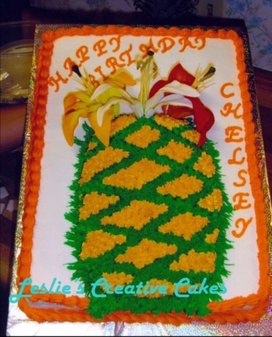 A pineapple cake...what a request!!! I think I did an okay job. How do you make a cake to look like a pineapple...this cake sure was a challenge. Have any ideas on how I could have done this different?