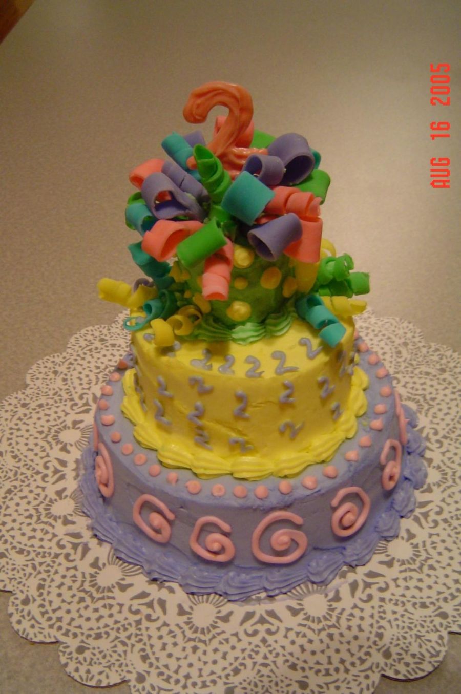 This was actually done for a baby shower at work (lady's second baby hence the 2 in the toppe), but it turned out a bit more whimsical and birthday-like rather than baby shower-ish. The #2 is candy melts and the bow and curlies are fondant. The rest is buttercream.