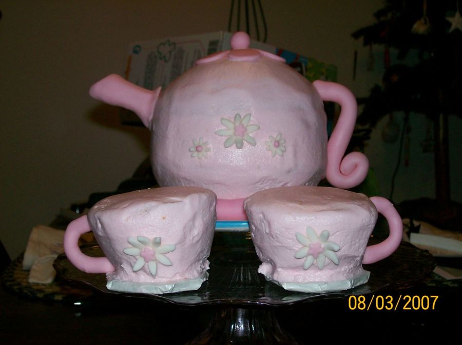 THIS WAS MY FIRST TEA POT CAKE. MADE OUT OF SPORT'S BALL WITH 6" ROUND IN THE MIDDLE. THE SPOUT AND HANDLE ARE FONDANT/GUM PASTE WITH TOOTH PICKS TO HOLD THEM ON THE CAKE. THE CUPS WERE DONE LAST MINUTE. THANKS FOR EVERYONE'S HELP ON CC!!!!
