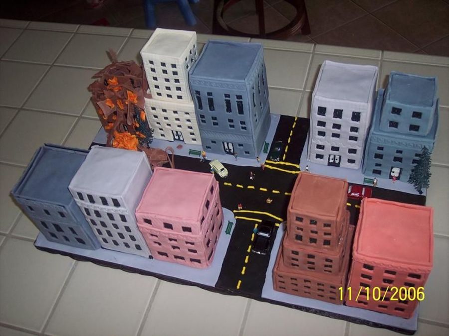 the buildings are 3 to 4 inch squares and covered in fondant. i cut out the windows and filled in with black buttercream. i didnt have godzilla with me at the time so he's not in the picture.
