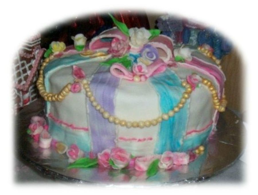 Four layer tort Coconut cake, coconut filling and Butter cream frosting. Covered with Fondant. Hand made Rose's and gold dust beads. Just thought I would try!