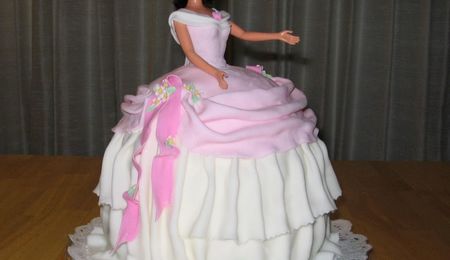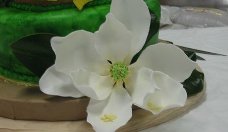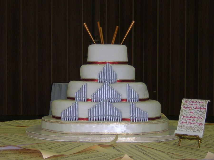 This cake was created for Dame Gillian Wier, an English organist, who gave a concert at our church. The organ pipes, handmade from gumpaste and painted with silver petal dust, represented the various styles of pipes on our organ. The trumpets at the top were made from royal icing and painted with copper petal dust. (The back of the cake is the following photo.) The cake is actually in a "figure eight shape" composed of two 12', two 9" and two 6" rounds and an oval topper. All is covered in rolled fondant.