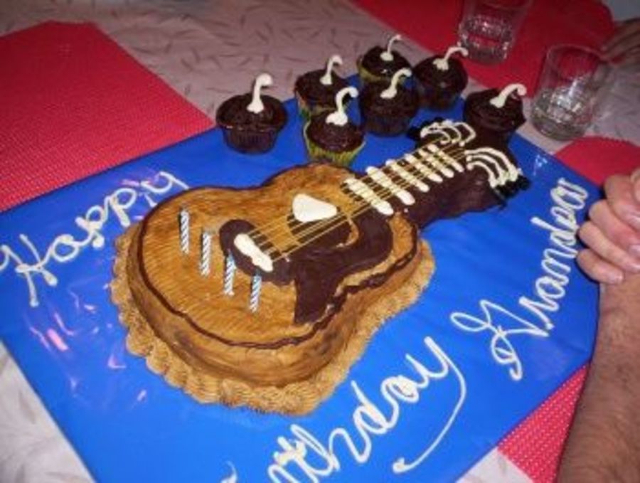 my husband plays guitar so I wanted to do him a cake like his. the colouring turned out great [ almost the same colour as his ] Spagetti for strings. White chocolate for pick and dark chocolate for trim ect . Few cupcakes with white chocolate music notes.