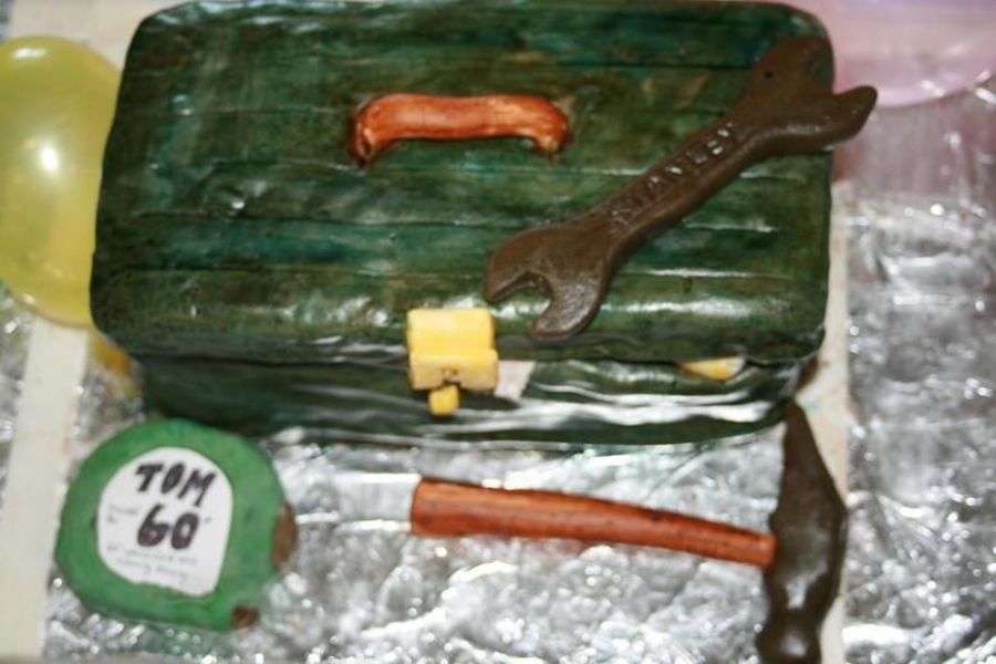 Toolbox cake for my father in law who was turning 60. Tape measure says 60' and still going strong. First cake that I had major problems with! It was bulging and fondant was too soft, etc. ack! Glad it was eaten same day! Tools and accents are fondant, tape measure is mini cake. Cake was german chocolate with coconut frosting (which explains some lumps..but not all)