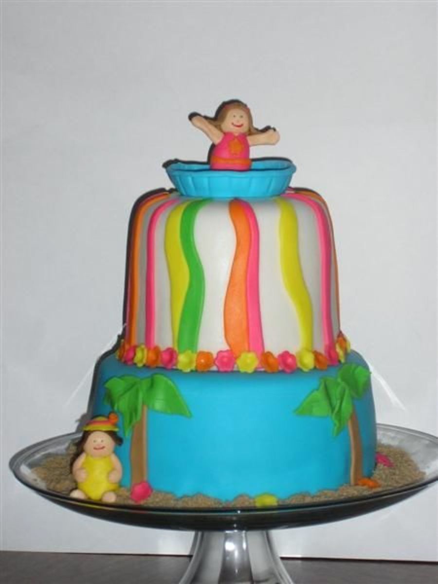 Inspired from Sugar Creations cute pool party cake! Decorated in mmf with brown sugar for sand. I wanted an occasion to make a big cake so I made this for our summer vacation. I attempted fondant figures for the first time and tried to make them look like my little girls!