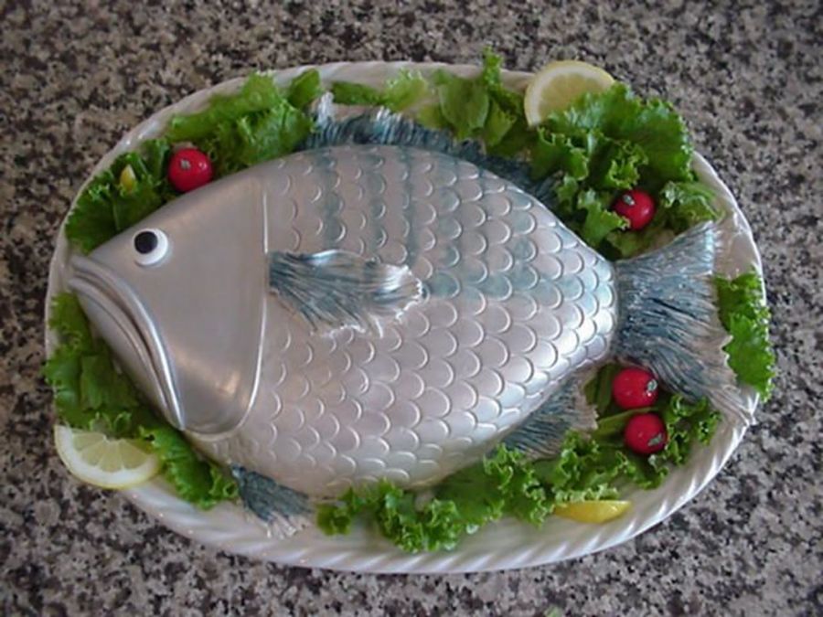 Inspired from a cake in Colette Peters' book. Sculpted cake, covered with fondant. Painted with Luster Dust. Fondant cherry tomatoes. Lettuce and lemons are from the grocery store!! ;) Now, that's my kinda fish!!