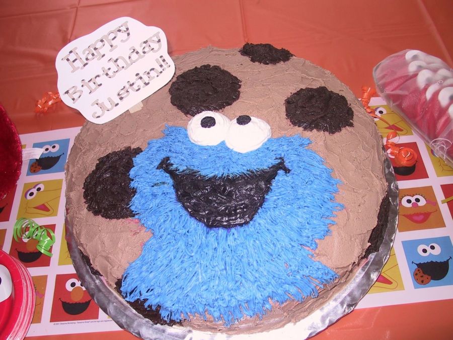 This is a fun cake. I did it for my son's 2nd birthday. It is a 14" round cake. The fun thing is that it could work in ANY size. I also did the SAME cake for my son's preschool graduation party, only cookie monster had a mortorboard hat with a tassle on.