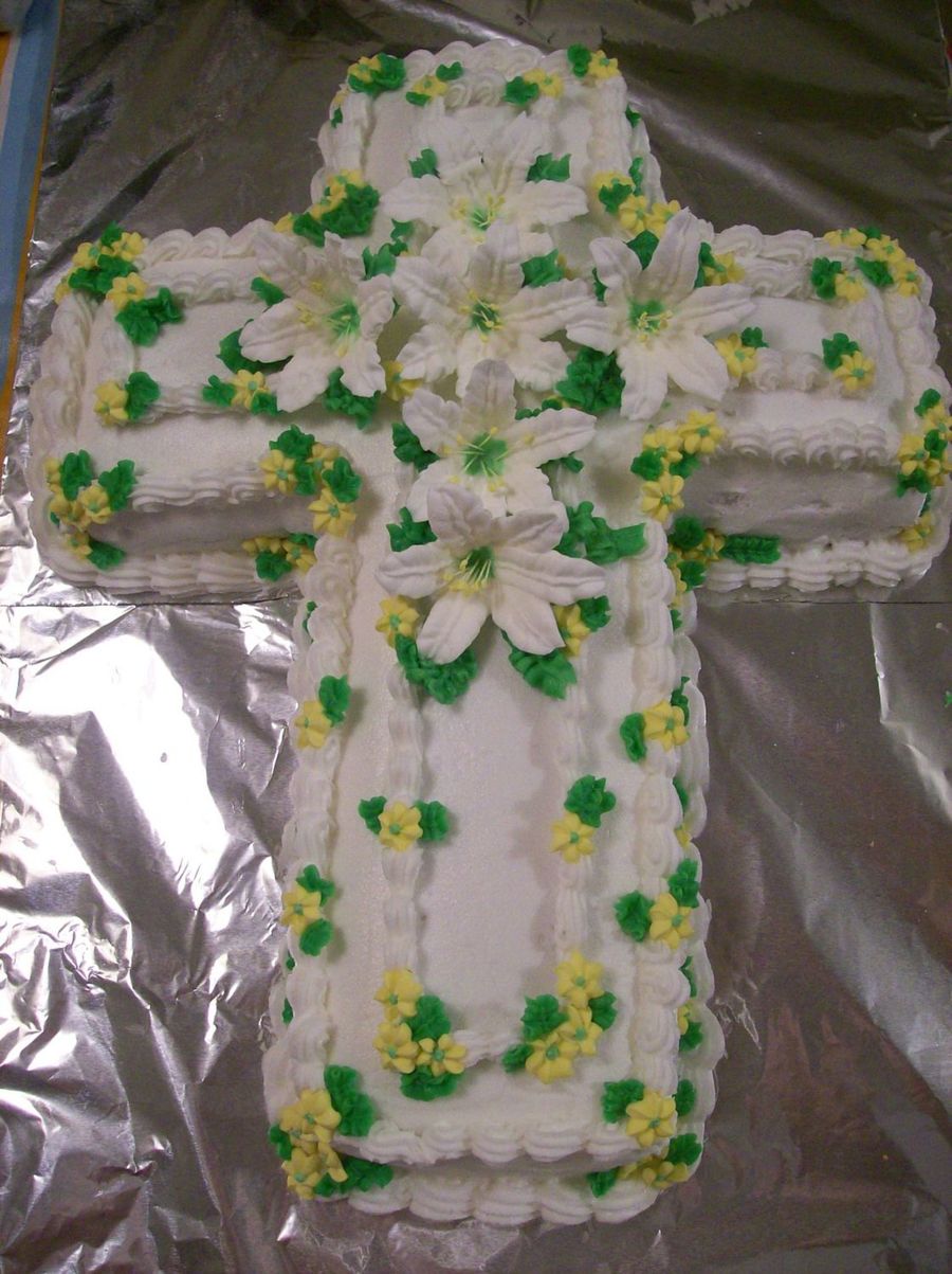 Cake is vanilla with vanilla buttercream. Flowers and easter Lilies are royal icing. Made for a church Good Friday Dinner.